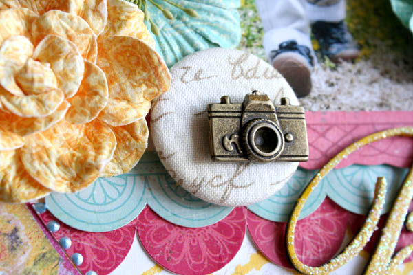 I also paint the chipboard, one with acrylic paint, the other one with glimmer glam. I add a pearl brad on the bicyle's wheel.