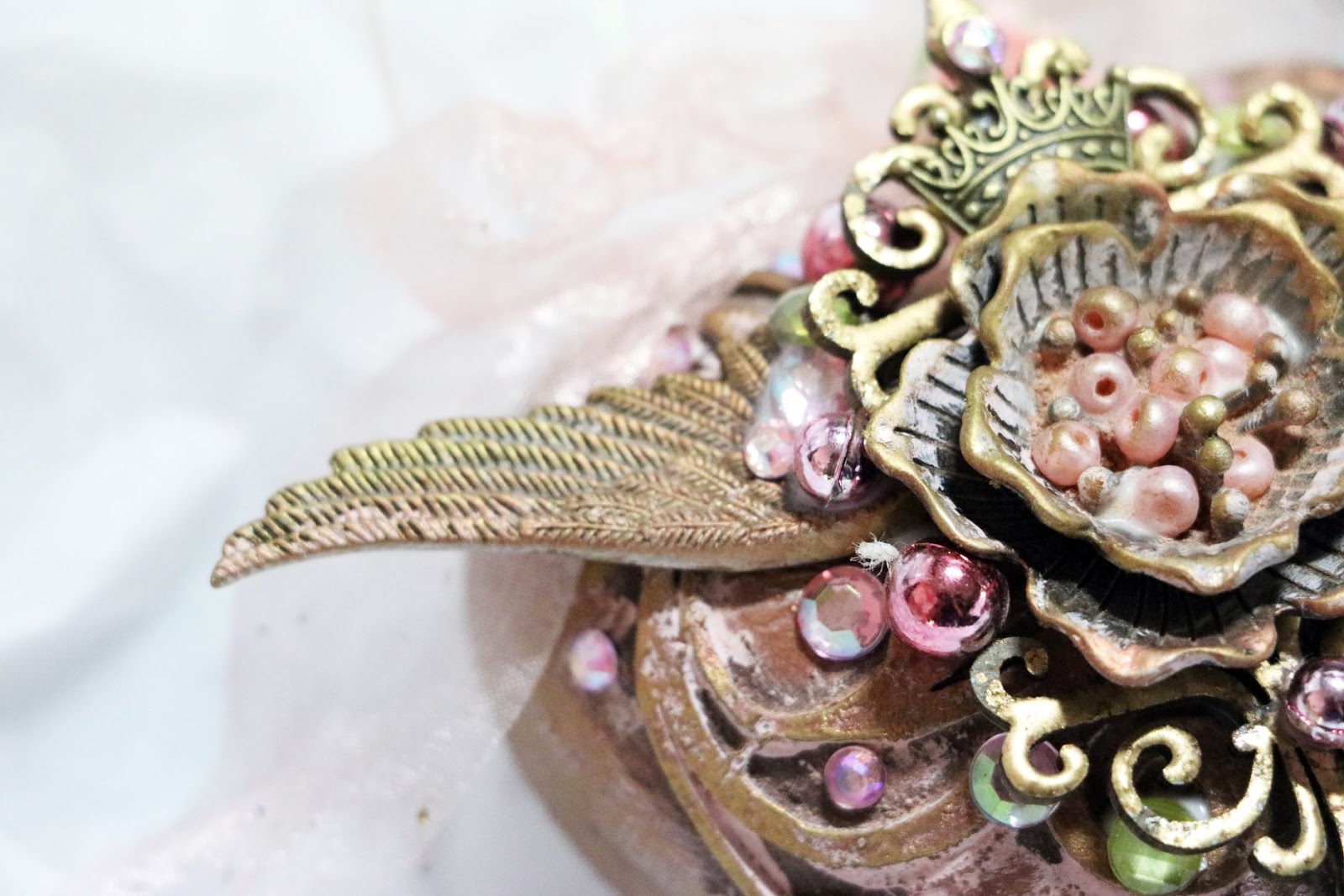 For a nice contrast to the chalky paint I have added fold shiny trinkets and gorgeous pink beads and bling. The secret to remember always is contrast contrast and more contrast, if you want to make your work "pop". To finish, I tied a peach organza ribbon to the