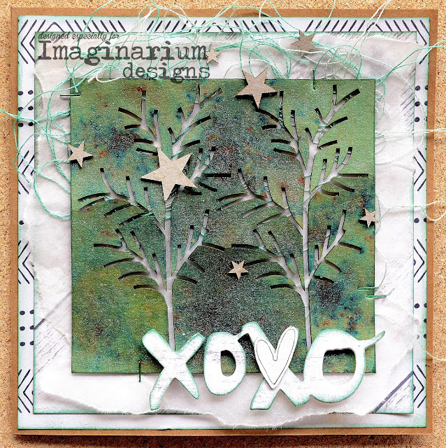 For this card, I made the negative board from the Twigs chipboard the centrepiece. I sprinkled it with Brusho Olive Green Colour and then spritzed all over with Lindy's Stamp Gang Mad Hatter Mint Starburst Spray.